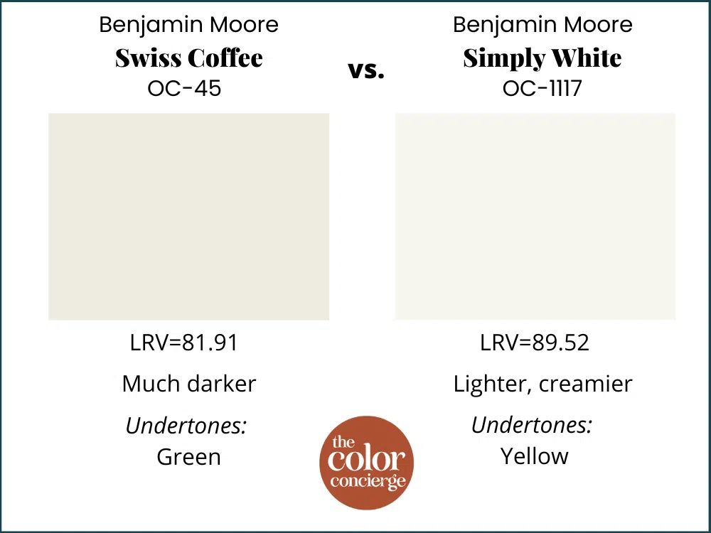 Behr also has a warm white paint color called Swiss Coffee. However, while the two hues may look (and sound) the same at first glance, they are actually very different.