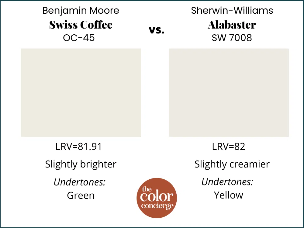 No, it’s not. While Swiss Coffee’s green undertones lean toward yellow, Alabaster has true yellow undertones. Even though both colors have the same LRV of 82, Alabaster looks creamier in place and is more likely to look yellow on the wall than Swiss Coffee.