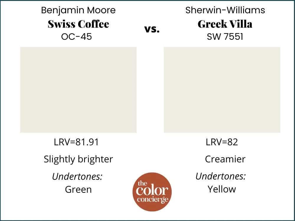 Sherwin-Williams Greek Villa (sample) and Benjamin Moore Swiss Coffee also have the same LRV, so they are similar colors. But other properties make them look different on the wall. Greek Villa is lighter and brighter, with yellow undertones instead of green, so it looks more crisp on the wall.