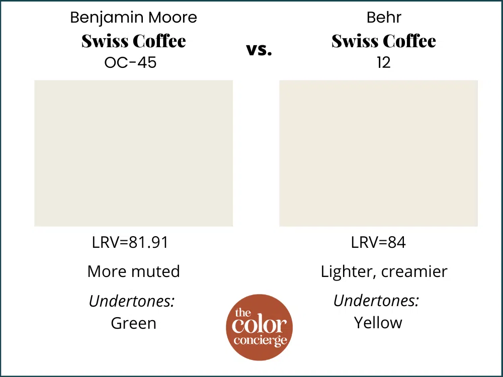 Behr Swiss Coffee (12) has stronger, buttery yellow undertones and is less muted than the Benjamin Moore version. It’s still a beautiful color, but may not work in the same spaces.