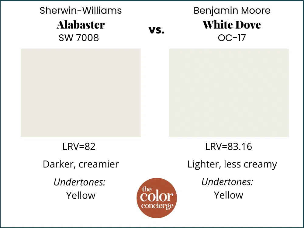 SW Alabaster and BM White Dove (Sample) are pretty similar colors, but White Dove is a bit lighter. Both colors have grayed-out yellow undertones, but White Dove (Color Review Article) is a bit more grayed-out and muted so it looks less creamy on the wall. I use both paint colors in similar situations.