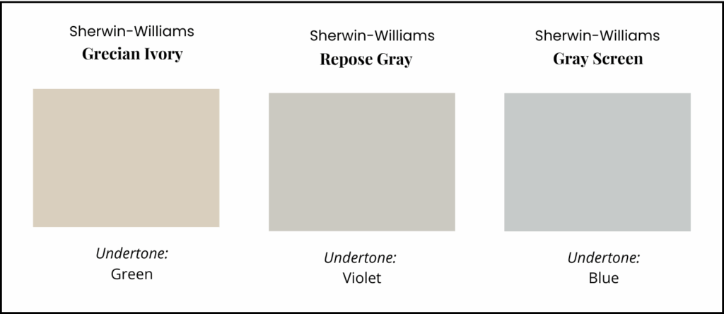 Like most gray paint colors, it can be hard to see Repose Gray’s undertones until it’s compared to greige hues with different undertones. In the graphic below, you can clearly see this color’s violet undertones.
